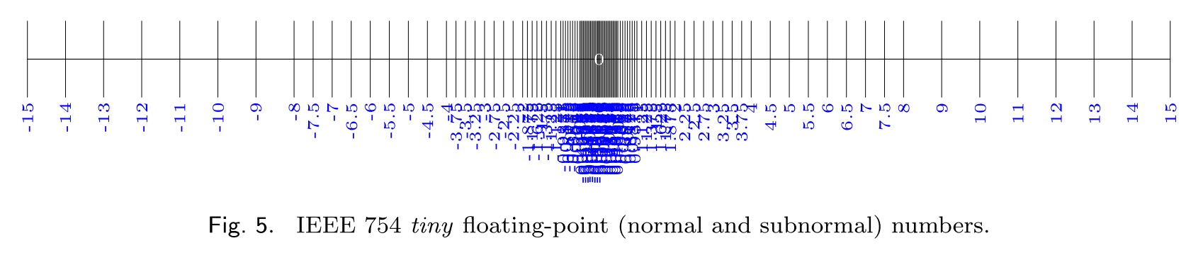 More interestingly, though, the standard also defines some special values: ±infinity, and “quiet” & “signaling” NaN. ±infinity are self-explanatory overflow behaviors: in the visualization above, ±15 are the largest magnitude values which can be precisely represented, and computations with values whose magnitudes are larger than 15 may overflow to ±infinity. The spec provides guidance on when operations should return ±infinity based on different rounding modes.